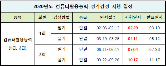 2020년도 컴퓨터활용능력 1급 2급 자격검정 시험 일정 대한상공회의소 시행
