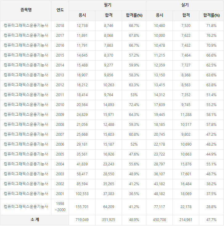 2018년까지 시행한 컴퓨터그래픽스운용기능사 자격검정 응시현황과 필기시험 기출문제