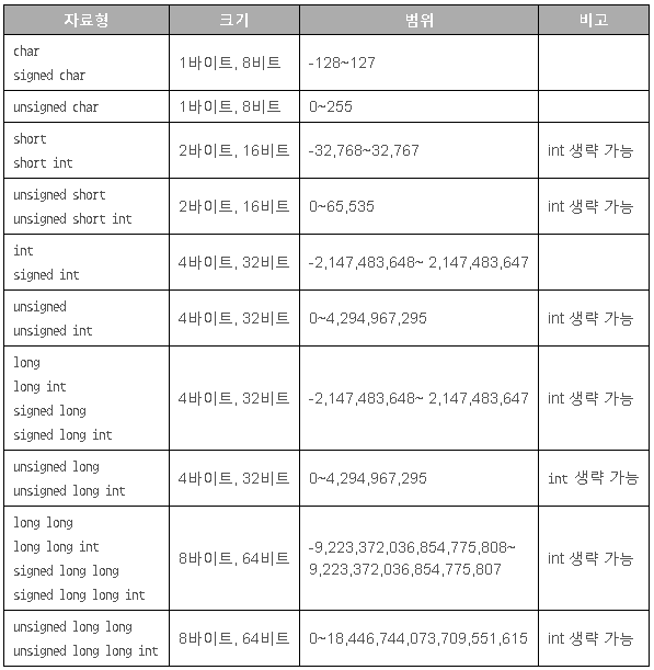 C언어 각 데이터형 범위